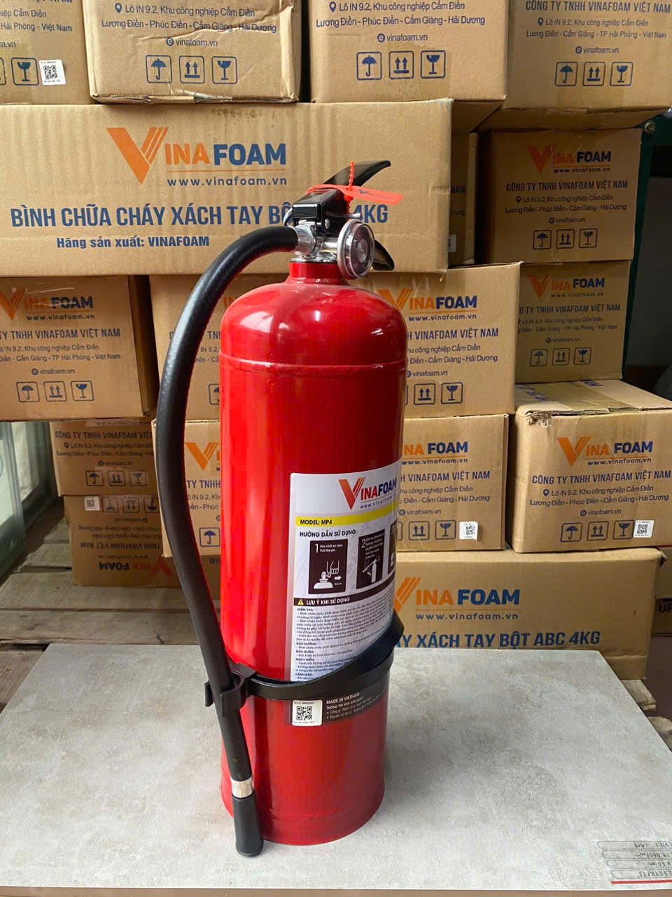 Bình chữa cháy bột ABC 4kg VinaFoam M4-P là sản phẩm chuyên dụng để dập tắt các đám cháy loại A (cháy vật liệu rắn như gỗ, giấy, vải), loại B (cháy chất lỏng như xăng, dầu, mỡ) và loại C (cháy khí đốt). Với thiết kế nhỏ gọn, dễ sử dụng, hiệu quả dập lửa cao và giá thành hợp lý, MP4 là lựa chọn lý tưởng cho nhiều không gian như nhà dân, văn phòng công ty ,chung cư mini, nhà xưởng, kho hàng, gara ô tô,… để bảo vệ an toàn cho người và tài sản.