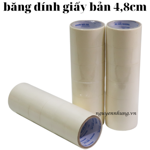 Băng dính giấy bản 4,8 cm loại dày loại đóng 6 cuộn /1 cây. Màu sắc: màu trắng đụcChất liệu: bằng giấy kếp và keo cao su, chịu được nhiệt độ lên tới 180 độ CKích thước: bản rộng 4,8 cmĐộ dài: 25 ya = 22,5 mét dàiTrọng lượng: khoảng 0,81 kg/câyĐóng cây: 6 cuộn/câyCông dụng: Dùng nhiều trong văn phòng, dùng dán bảo vệ để sơn, phun màu, ...Giá bán: 60.000 đồng / cây ( 6 cuộn)