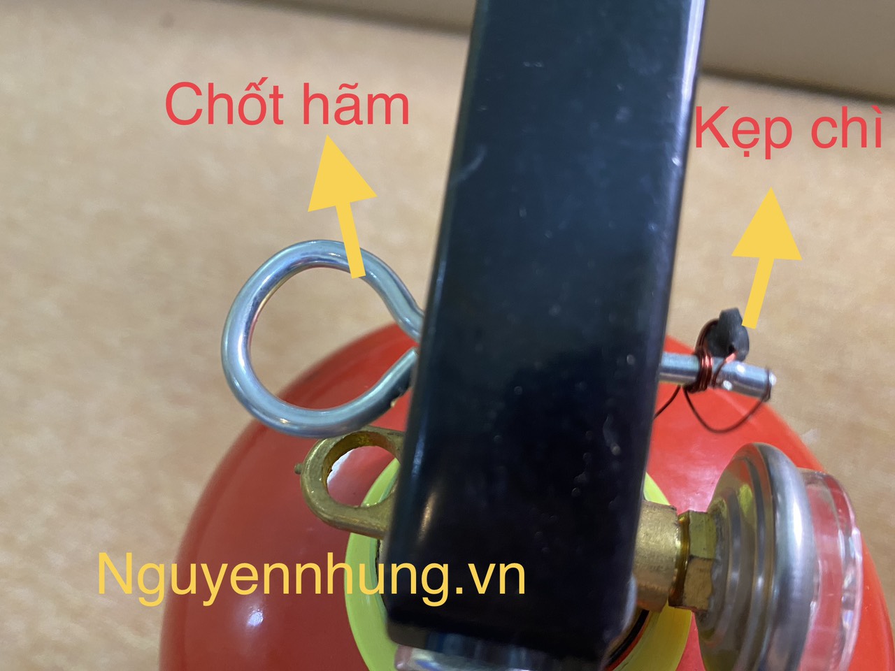 - Kẹp chì và chốt hãm để giữ tay cầm ở vị trí đóng, ngăn người dùng vô ý bóp tay cò thì bột sẽ phun ra. Khi cần dập cháy chúng ta sẽ phải giật đứt kẹp chì, rút chốt hãm ra khỏi bình mới có thể phun được bột ra khỏi bình