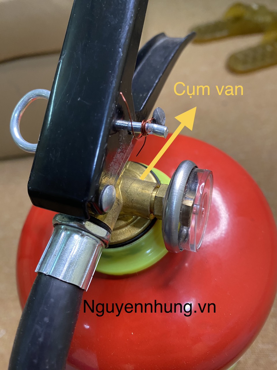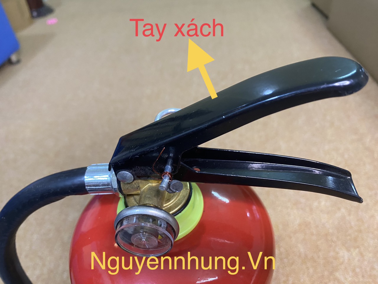- Tay xách hay còn gọi là cò bóp. Có tác dụng làm tay xách bình khi cần di chuyển bình đến nơi dập cháy. Khi đã rút chốt hãm thì dùng tay thuận của mình bóp chặt vào cò bóp bột sẽ được phun ra khỏi bình theo đường dẫn của vòi phun.