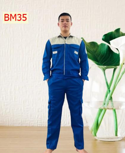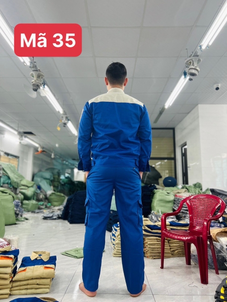 Vải thấm hút mồ hôi tốt, toàn bộ các đường may ở nách và đũng quần , đường may 2 bên sườn đều được may 2 kim tức là may 2 đường chỉ nên rất chắc chắn khi người lao động vận động không lo bị rách nách áo và đũng