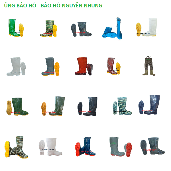 Chúng tôi cung cấp các loại ủng nam, nữ, màu đen, màu xanh cửu long, màu nâu, màu bộ đội, màu trắng, màu rằn ri, màu trà trong; ủng mũi sắt, ủng chống axit, ủng yếm lội nước, ...
